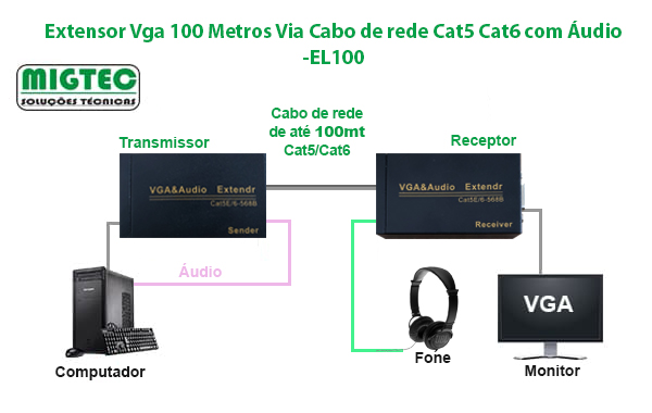 Extensor Vga 100 Metros Via Cabo de rede Cat5 Cat6 com Áudio -EL100